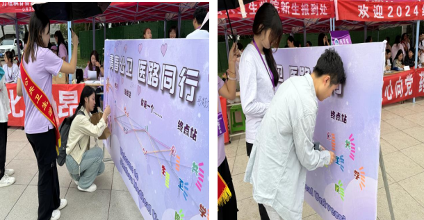 迎新中设计特色的“青春公卫 医路同行”互动环节以及“乘风破浪 梦想起航”打卡留念环节,预示着新起点新征程从公卫启航,并在绕线互动结束后领取公司为新生精心准备的“新生见面礼”,打卡留念,开启大学新征程。